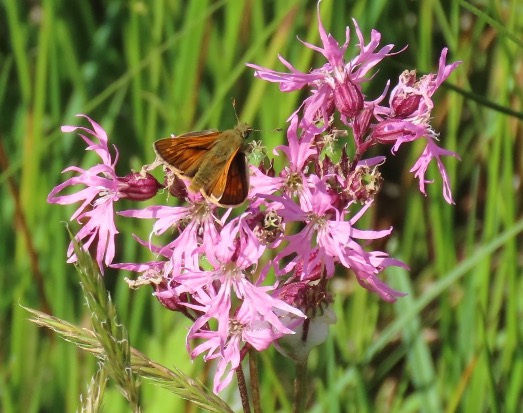 Due to drainage and agricultural improvement of wet grassland in the UK, populations of Ragged Robin (Silene flos-cuculi) have declined over the past decades and it is now described as Near Threatened on the England Red List of Vascular Plants. A few isolated Ragged Robin plants occur in the hay meadows, Fields 1 and 2 but Ragged Robin is found mainly in the wetter area Field 6. The Ragged Robin flowers, which are seen on the site from May to June, are usually bright pink but one white flowered plant has been recorded in Field 6. Ragged Robin is attractive to a variety of insects.