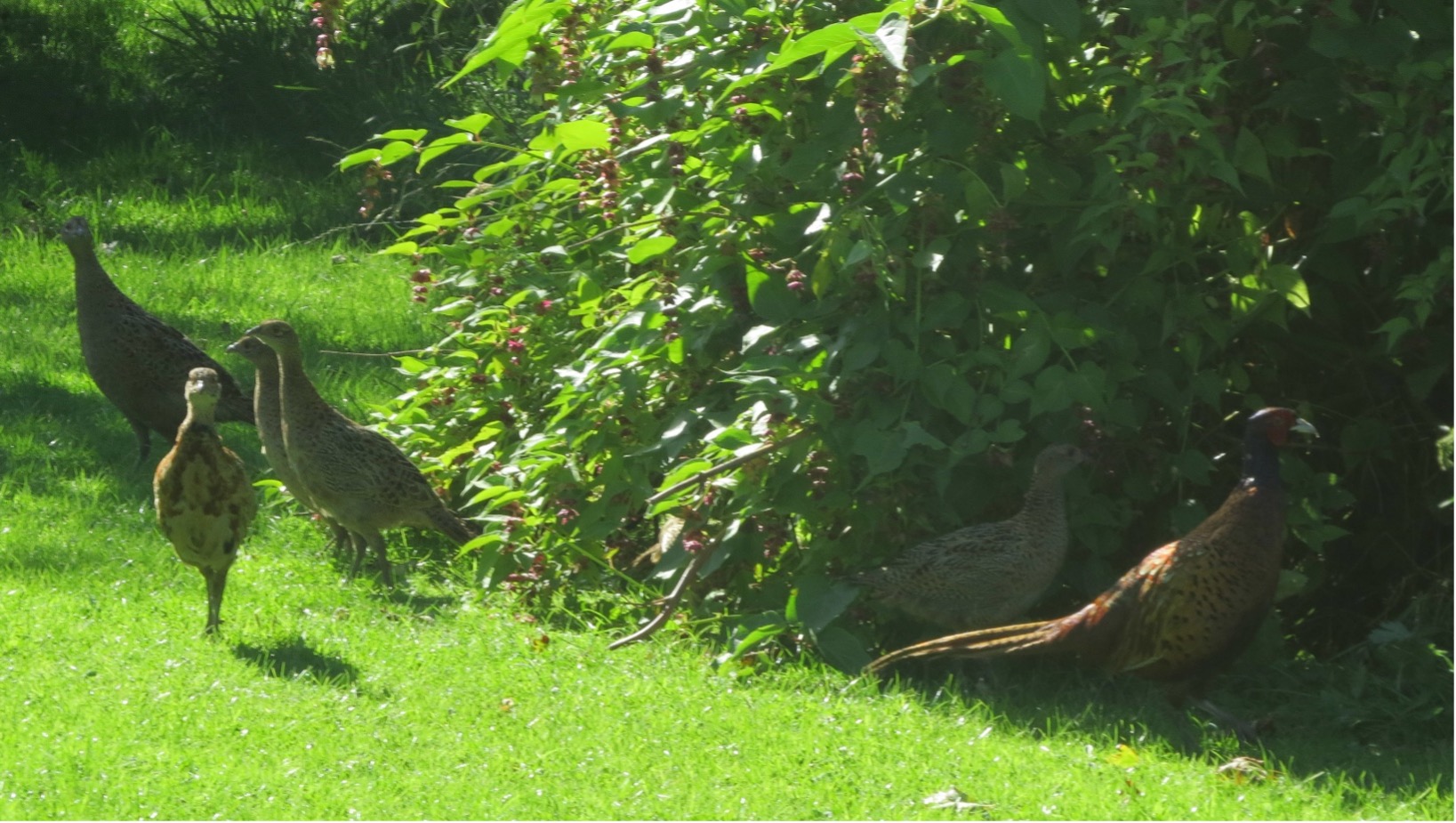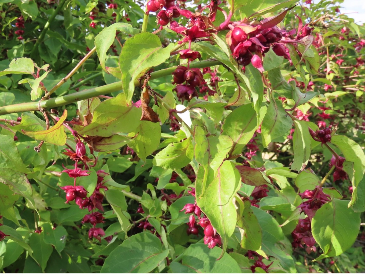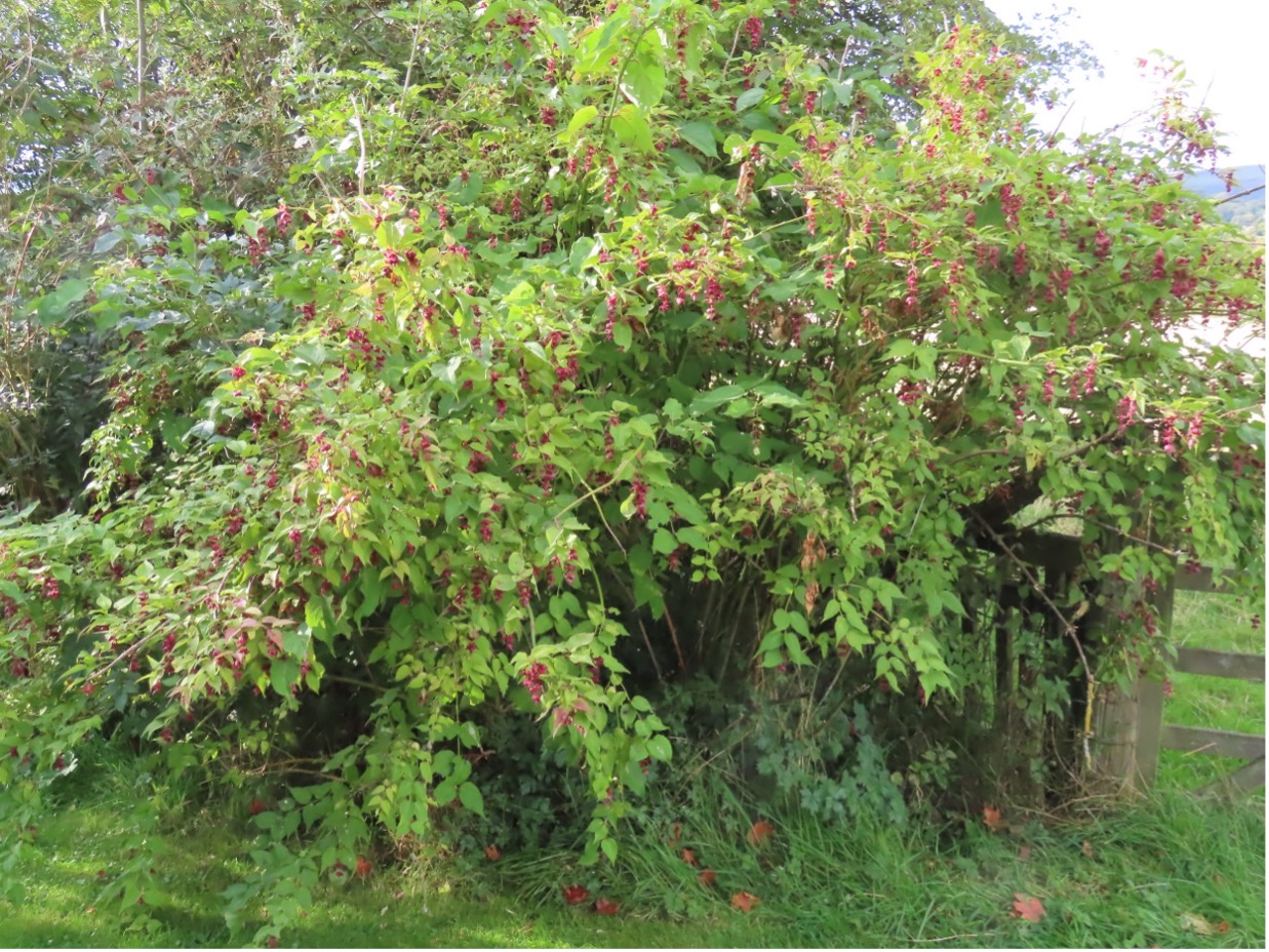 Pheasant Berry (Leycesteria formosa) is not a native plant but it is present in Downlee Lodge Orchard. It has pendulous clusters of attractive flowers in late Summer followed by reddish-purple berries in Autumn. As its name suggests the berries are relished by birds and particularly by pheasants.