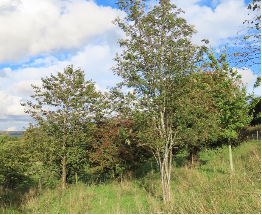 Rowan (Sorbus aucuparia) also known as Mountain Ash is an upright, elegant but robust tree that has distinctive leaves, attractive flowers in late spring and striking bunches of bright red berries that are eaten by birds, particularly birds of the thrush family in autumn. There are two Rowan trees in Field Corner W2, next to the public footpath at the top of Field 2 and others in Downlee Lodge garden and orchard.